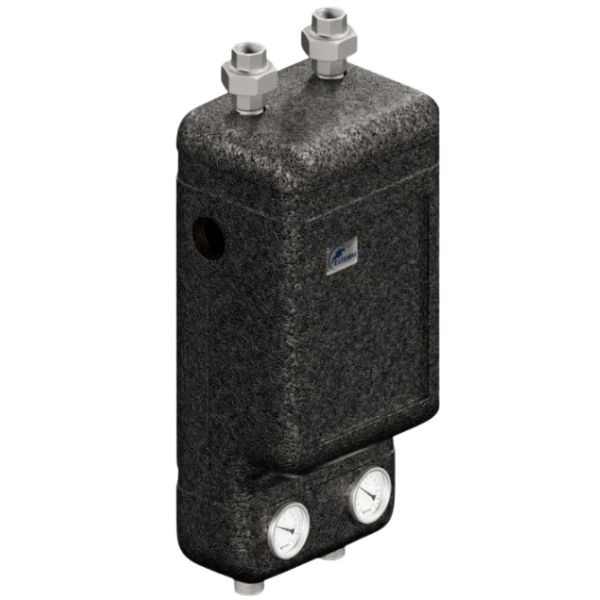 W prezentowanej wersji sercem układu jest pompa Grundfos UPM3 Auto L 25-70. Jest to jedna z najnowocześniejszych pomp na rynku, spełniająca rygorystyczne normy efektywności energetycznej (ErP Ready). Dzięki silnikowi z magnesami trwałymi, zużywa ona ułamek energii w porównaniu do starych modeli. Oferuje szereg trybów pracy, w tym autoadaptację oraz tryby stałociśnieniowe dedykowane do ogrzewania podłogowego. Całość osłonięta jest dopasowaną izolacją z EPP (spienionego polipropylenu). Materiał ten jest lekki, twardy i posiada doskonałe właściwości termoizolacyjne. Izolacja chroni elementy hydrauliczne przed uszkodzeniami mechanicznymi, a przede wszystkim zapobiega niekontrolowanej ucieczce ciepła do pomieszczenia kotłowni, co zwiększa sprawność całego systemu. Estetyczny, czarny design izolacji wpisuje się w trendy nowoczesnych maszynowni.