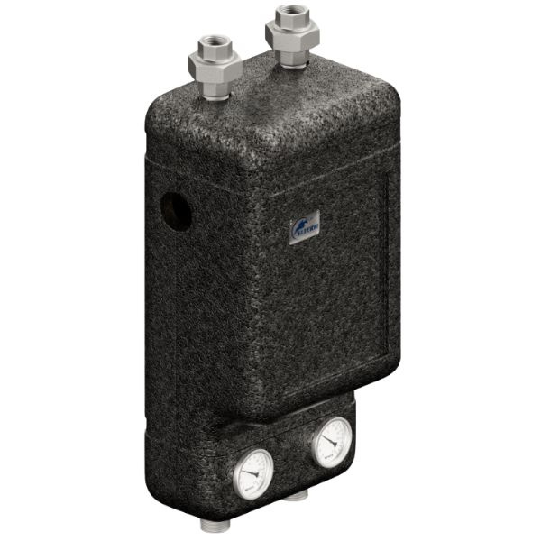 W tej wersji zestaw napędzany jest przez pompę Grundfos UPM3 Auto L 25-70. To urządzenie klasy premium, wyposażone w silnik z magnesami trwałymi, co zapewnia najwyższą sprawność energetyczną (EEI ≤ 0.20). Pompa oferuje dedykowane tryby pracy do ogrzewania podłogowego (stałociśnieniowe), co eliminuje szumy przepływowe. Cały zespół hydrauliczny został zamknięty w dopasowanej obudowie z EPP (spienionego polipropylenu). Materiał ten pełni podwójną funkcję: po pierwsze, jest doskonałym izolatorem termicznym, który zatrzymuje ciepło wewnątrz rur, zwiększając sprawność układu. Po drugie, stanowi estetyczną i mechaniczną osłonę dla armatury, nadając kotłowni nowoczesny, uporządkowany wygląd. Montaż grupy jest prosty i szybki, co oszczędza czas instalatora.