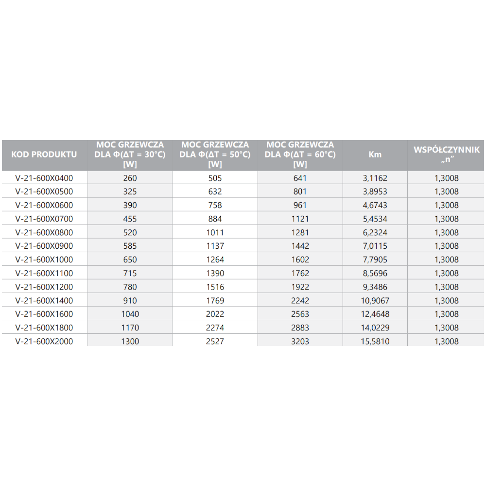 KOD PRODUKTUMOC GRZEWCZA DLA Φ(ΔT = 30°C) [W]MOC GRZEWCZA DLA Φ(ΔT = 50°C) [W]MOC GRZEWCZA DLA Φ(ΔT = 60°C) [W]KmWSPÓŁCZYNNIK "n"