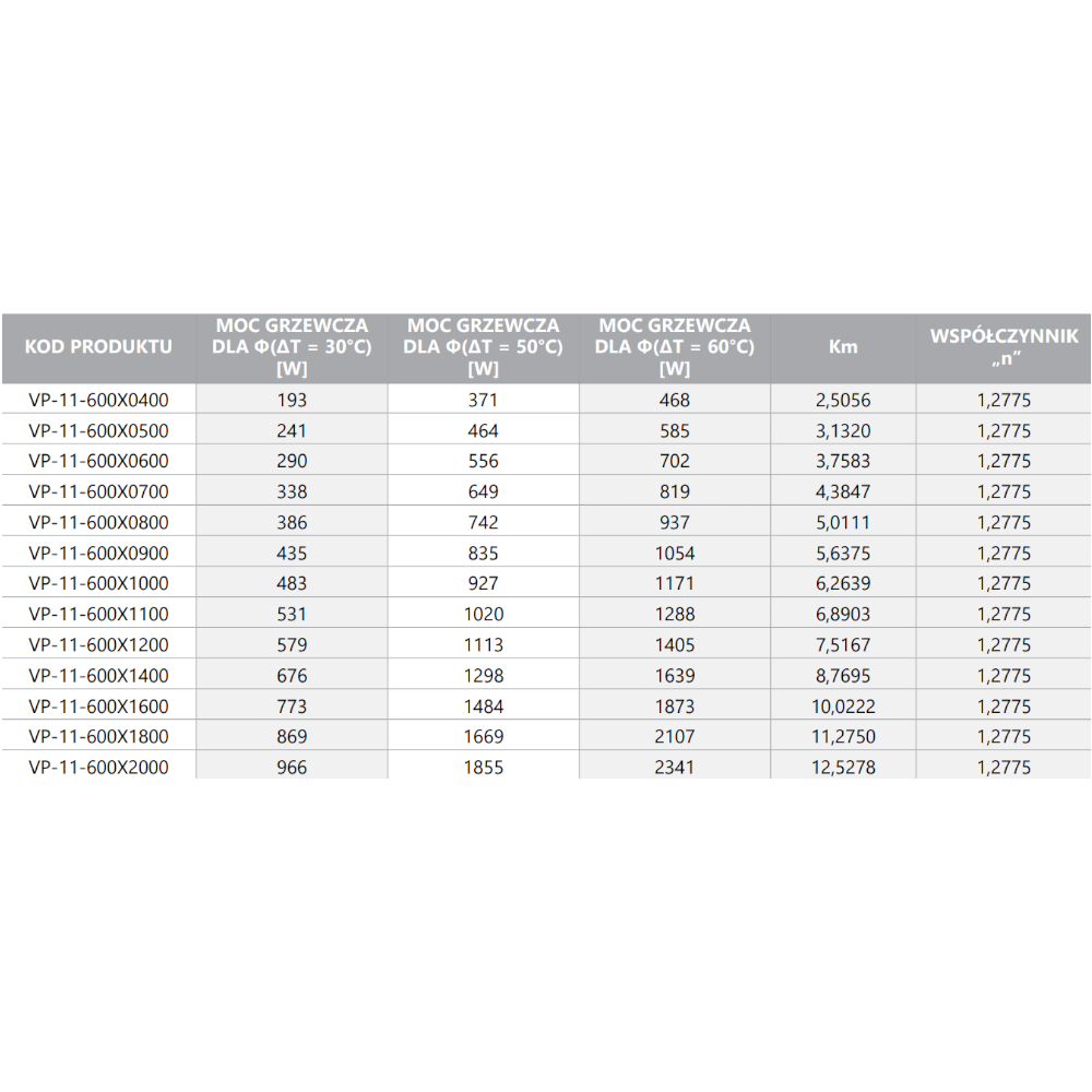 | KOD PRODUKTU | MOC GRZEWCZA DLA Φ(ΔT = 30°C) [W] | MOC GRZEWCZA DLA Φ(ΔT = 50°C) [W] | MOC GRZEWCZA DLA Φ(ΔT = 60°C) [W] | Km | WSPÓŁCZYNNIK "n" |