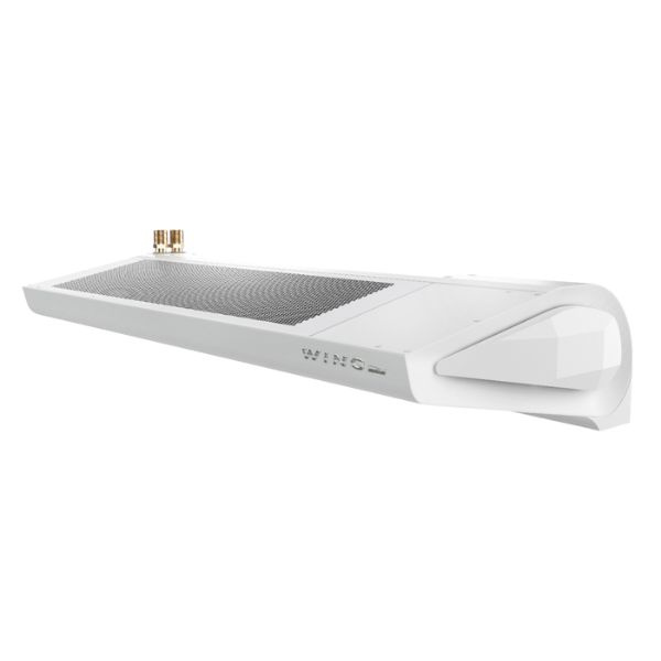 Strumień powietrza o wysokiej prędkości kierowany jest z góry w dół, tworząc blokadę powietrzną, która ogranicza napływ chłodnego powietrza z zewnątrz. WING II posiada zasięg do 4 m, co czyni go odpowiednim dla wejść zarówno pojedynczych, jak i szerokich, a w razie potrzeby kurtyny można zestawiać modułowo.