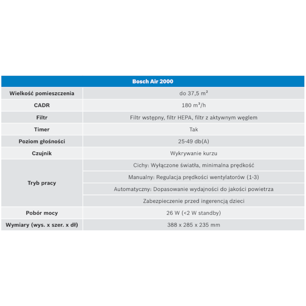 Bosch Air 2000 to niezawodny oczyszczacz powietrza, który łączy wysoką skuteczność, tryb cichy, inteligentne czujniki i atrakcyjny design. To kompleksowe rozwiązanie dla każdego, kto chce oddychać czystym powietrzem każdego dnia i cieszyć się lepszym zdrowiem oraz codziennym komfortem.