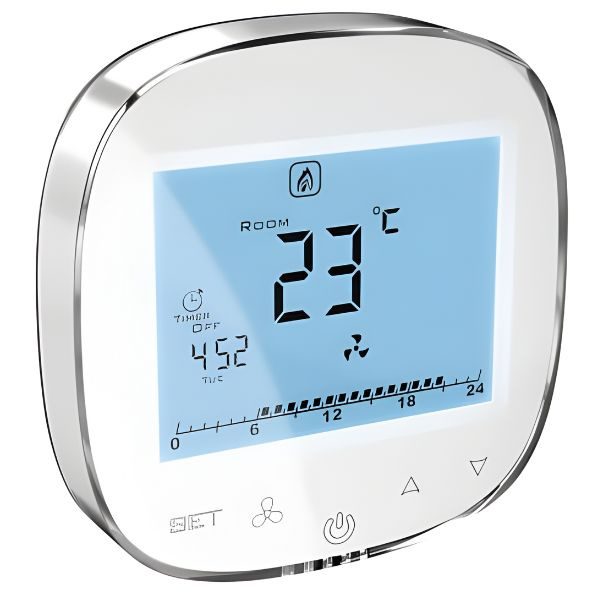 HMI WING EC (HMI WING HY) to zaawansowany panel sterujący do wszystkich rodzajów kurtyn powietrznych WING EC, który łączy wygodę obsługi z rozbudowanymi funkcjami automatyki. Sterownik posiada wbudowany termostat, tygodniowy programator pracy (osobne harmonogramy na dni robocze i weekend, po 4 okresy grzewcze na dobę) oraz umożliwia trójstopniową regulację prędkości wentylatora i trójstopniową regulację mocy grzania. Dzięki temu możesz precyzyjnie dopasować pracę kurtyn WING EC do godzin otwarcia obiektu, harmonogramu pracy lub zmiennych warunków pogodowych – bez konieczności ręcznego włączania i wyłączania.