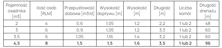 | Pojemność osadnika [m3] | Ilość osób [RLM] | Przepustowość dobowa [m3/d] | Wysokość dopływu [m] | Wysokość [m] | Długość [m] | Liczba komór | Długość drenażu [m] |